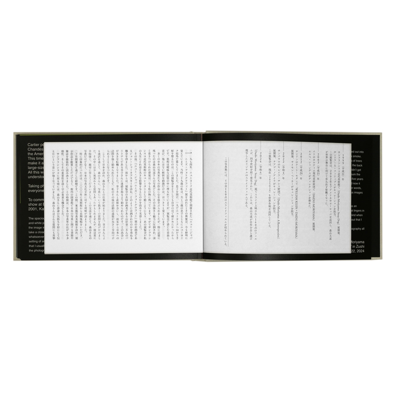 撮影時(1971年/青森県三沢市)から世に広まる過程で、表焼き・裏焼きのふたつの作品が存在することを表しています。さらに、世界の第一線で活躍する4名のキュレーターが、森山との出会いについて綴ったエピソード(英語)を掲載。森山自身がそれぞれのエピソードを読み、当時を振り返った貴重な談話(英語)も収められています。